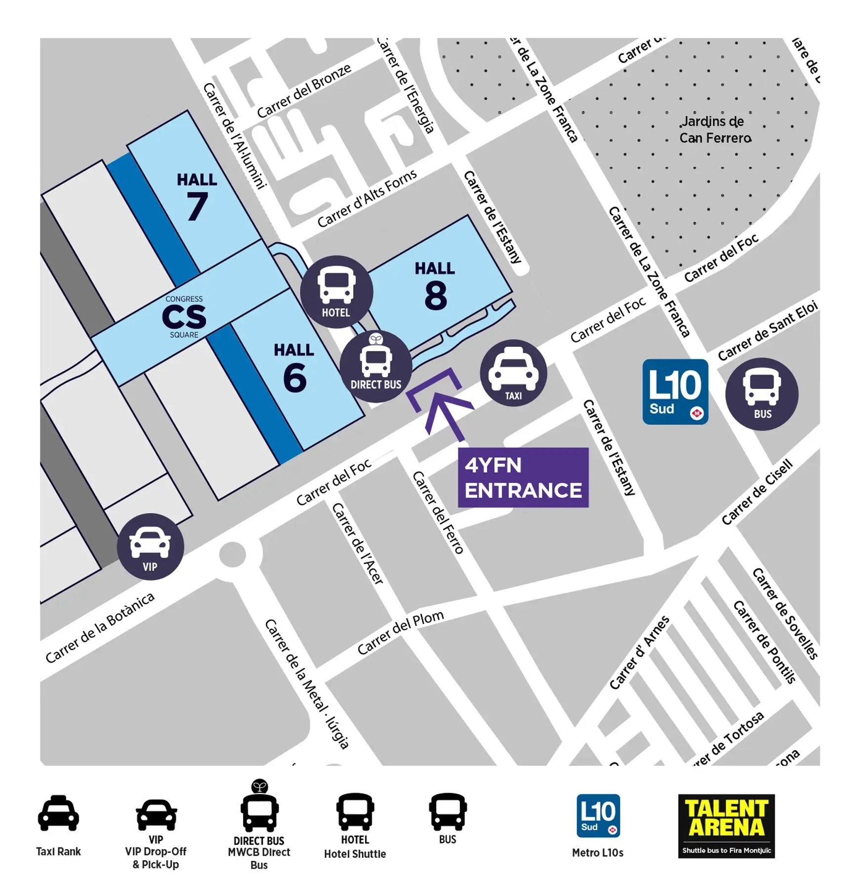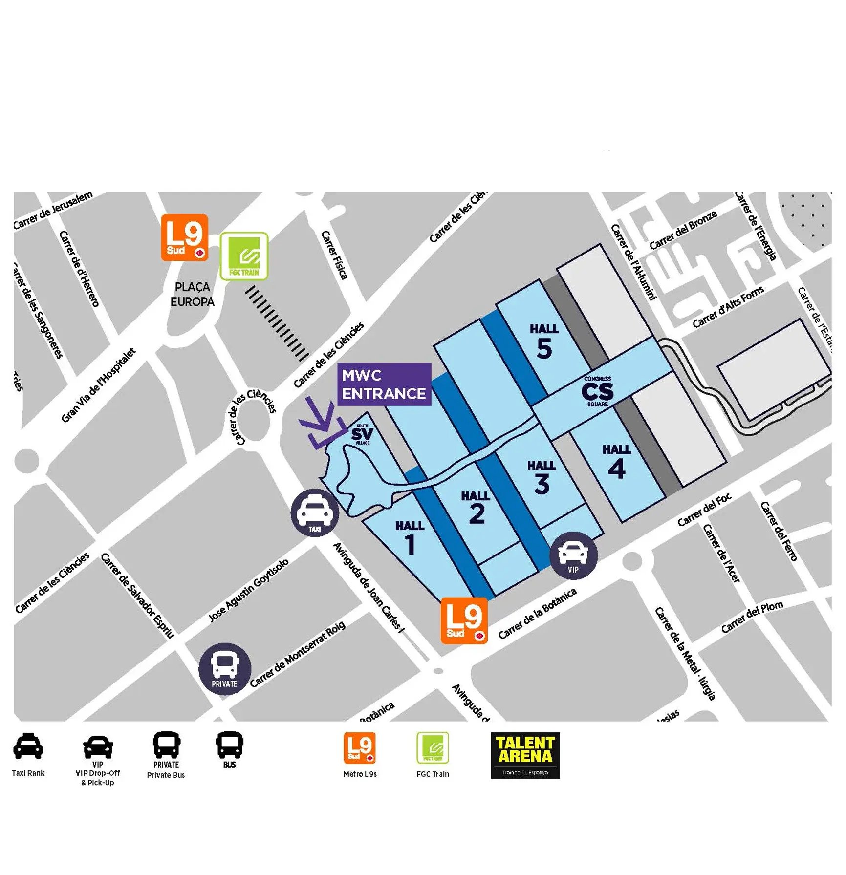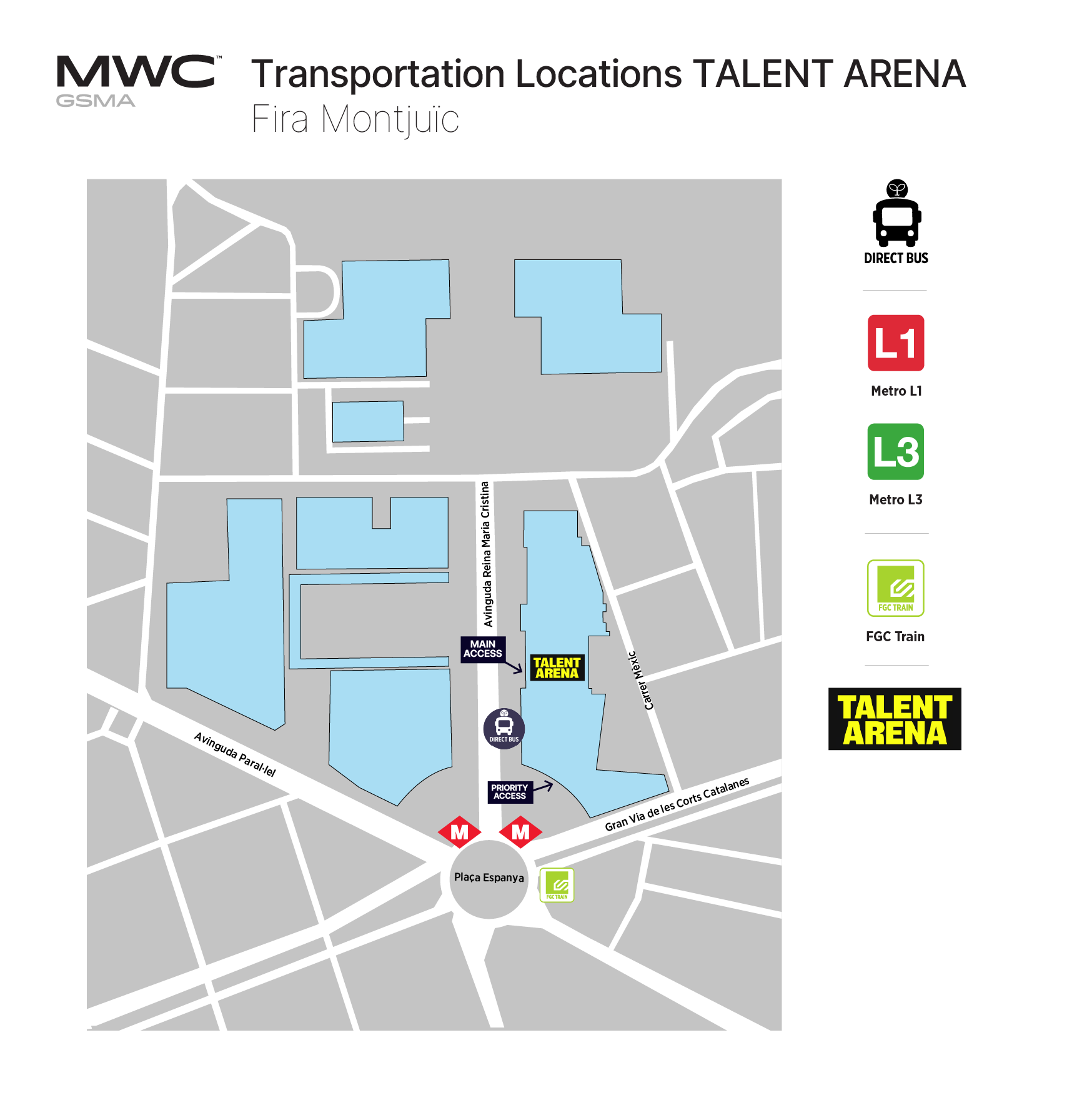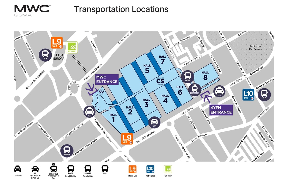 We strongly recommend using Barcelona’s fast and efficient public transport system as the quickest and most convenient way to travel between the city and the venue. To make it even easier, all MWC attendees receive a free transport pass, granting unlimited travel on buses, the Metro, and local FGC trains (Zone 1), including a trip to or from the airport.